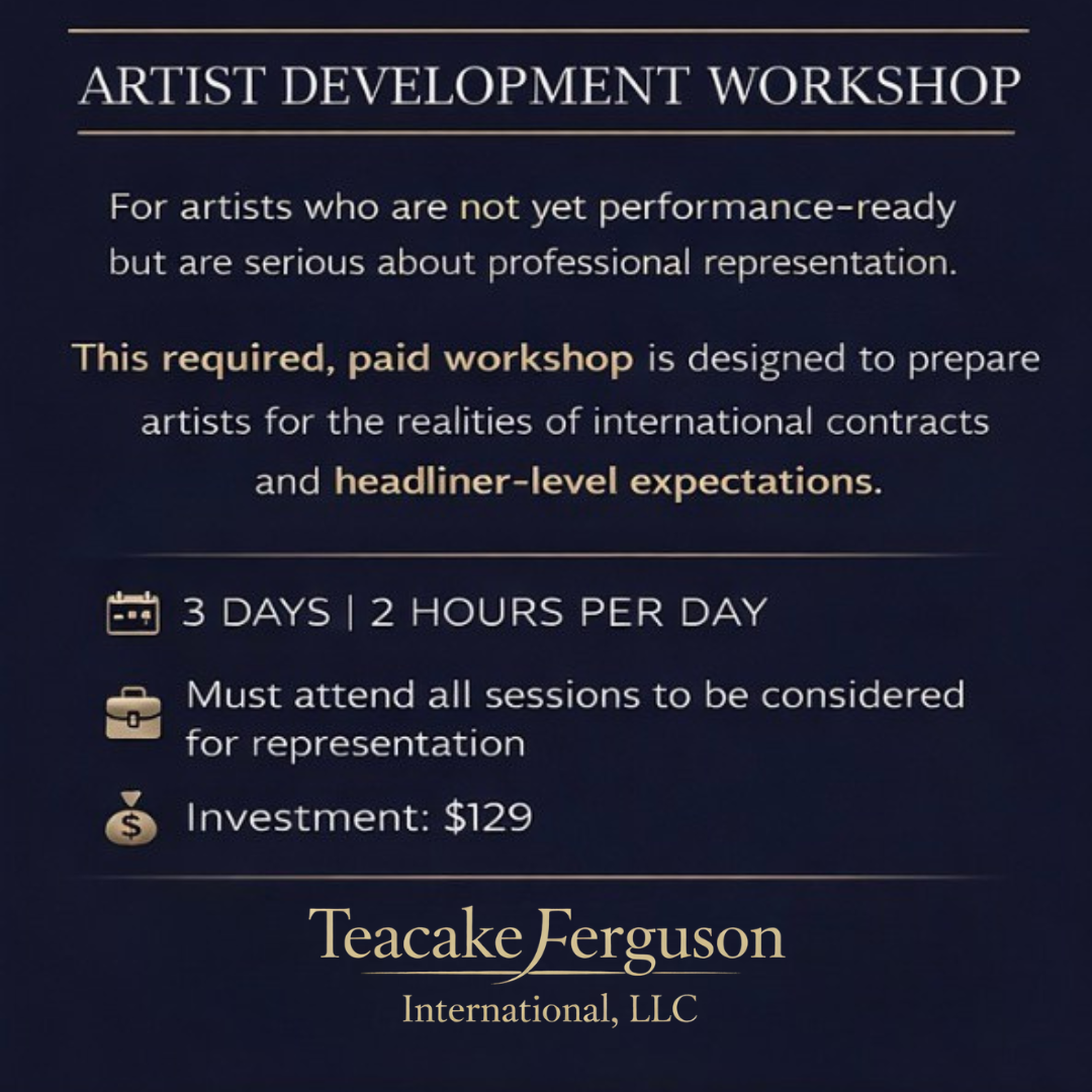 We will position you for success by developing your show(s). There is no guarantee that performers will be fully booked, but we will try our best to secure bookings. At Teacake Ferguson International, LLC, we understand what it takes to succeed in the competitive world of performance.